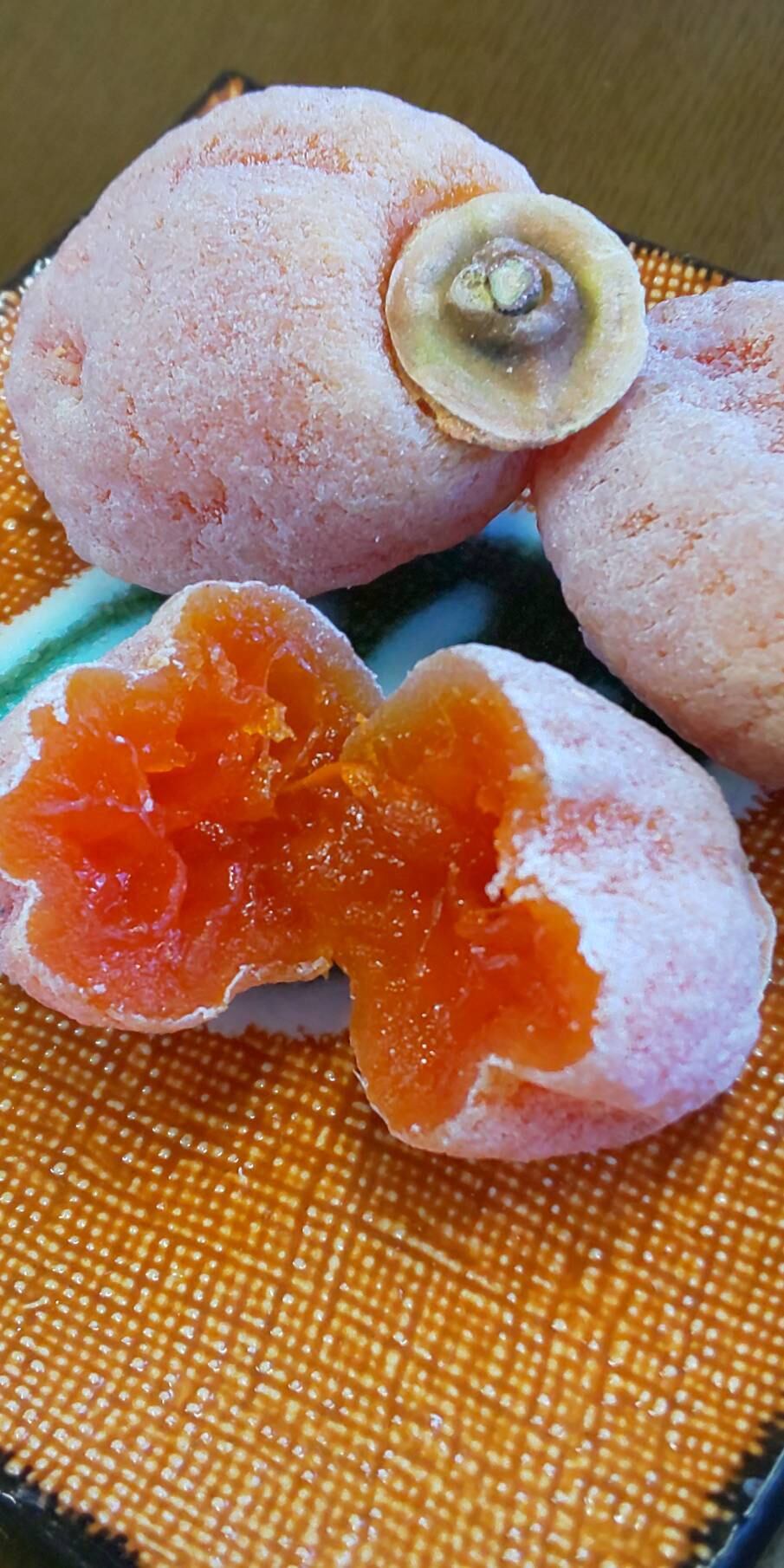 干し柿は、ころ柿とアンポ柿に分類されますが、「市田柿」はころ柿のタイプで、生柿に対する重量比で1/4程度まで干し上げられ、和風のドライフルーツと言われます。果実の表面は、きめ細かな白い粉に覆われ(白い粉は乾燥の過程で果実内部からしみ出したブドウ糖が結晶化したもの)、果肉はきれいなあめ色です。食味は、羊羹状のもっちりとした食感で、糖度が65~70%あり、天然糖分の上品な甘さが特徴です。また、20~30g程度の小さな干し柿で、お茶請けとして召し上がるには最適な大きさです。